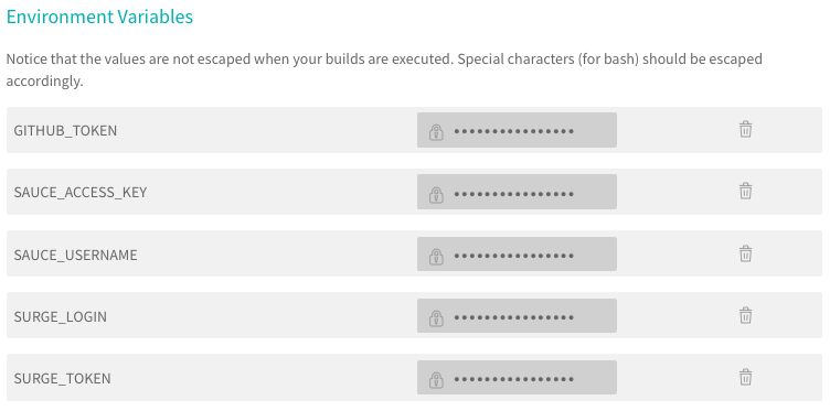 - Все необходимые ключи и токены для авторизации добавляем в переменные среды окружения Travis CI.